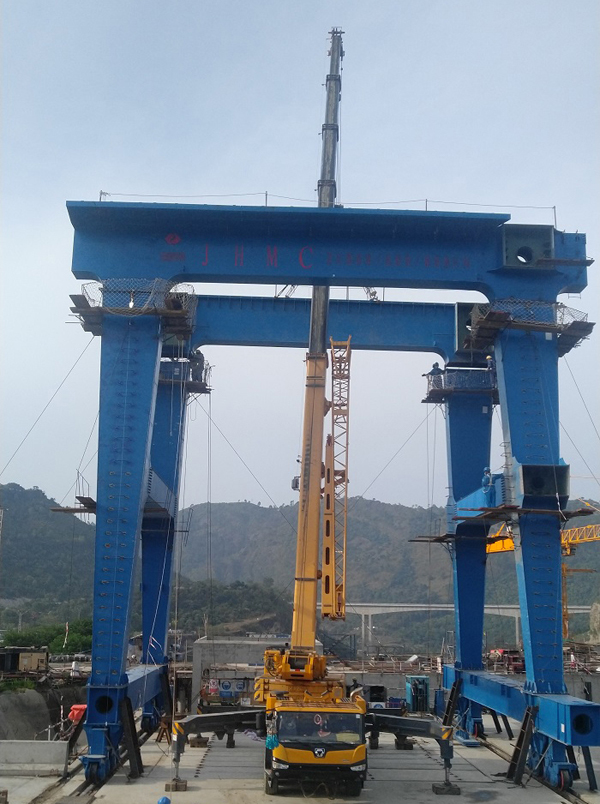 該門式啟閉機(jī)為2×800/600/600千牛雙向門機(jī),總重約382噸,主要由小車、門架、大車行走機(jī)構(gòu)、左右回轉(zhuǎn)吊等結(jié)構(gòu)組成;本次進(jìn)水塔雙向門機(jī)是卡洛特水電站安裝的首臺永久啟閉設(shè)備,主要用于進(jìn)水塔閘門、攔污柵的安裝及清污。