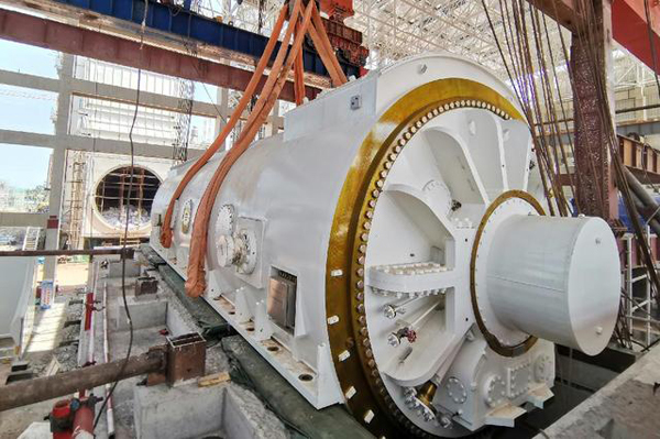 本次吊裝的2號(hào)機(jī)組發(fā)電機(jī)重量為360噸,是項(xiàng)目最重設(shè)備。安徽電建一公司策劃優(yōu)化吊裝方案,細(xì)致檢查吊裝系統(tǒng)安全、技術(shù)措施,并對(duì)作業(yè)人員進(jìn)行交底,強(qiáng)調(diào)發(fā)電機(jī)吊裝工序及安全注意事項(xiàng)。在管理人員的旁站監(jiān)督和作業(yè)人員的默契配合下,2號(hào)機(jī)組發(fā)電機(jī)被勞辛格吊裝系統(tǒng)緩緩提升至預(yù)定高度進(jìn)行轉(zhuǎn)向、平移,抵達(dá)發(fā)電機(jī)基礎(chǔ)中心線上方后緩慢降落,最終安全精準(zhǔn)就位。