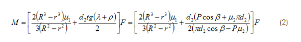 其中:F 表示為預(yù)期預(yù)緊力;M 是螺栓最終的擰緊力矩;d2 為螺紋中徑;P 為螺距;μ1 被連接件與螺母之間的摩擦系數(shù);μ2 為螺紋之間的摩擦系數(shù);β 為螺紋牙形半角;λ為螺紋升角;ρ 為螺栓螺母螺紋之間的摩擦角;R 為螺母支承面外圓半徑;r 為螺母支承面內(nèi)圓半徑。但是實際工作中如果按照(2)式計算螺栓的擰緊力矩會顯得非常麻煩,因此,為了便于實際工程的計算,對(2)進行簡化,最終得到下式: