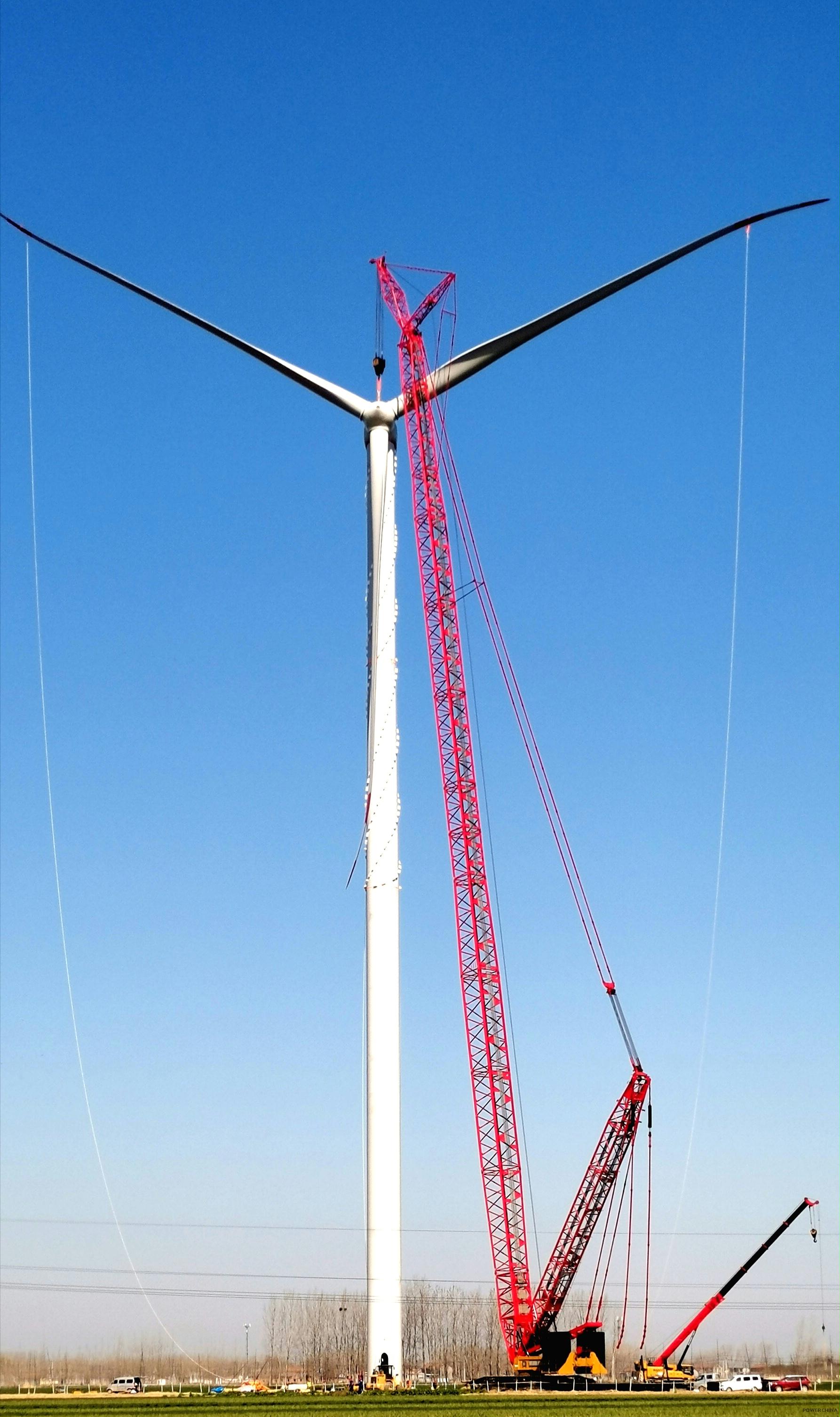 陽春時節(jié),山東西南二期100兆瓦風(fēng)電項目施工現(xiàn)場艷陽高照。3月15日, 隨著SCC6500A履帶吊將66噸葉輪提升至125米就位高度,輪轂與機艙實現(xiàn)完美結(jié)合,宣告山東西南二期100兆瓦風(fēng)電項目首臺風(fēng)機吊裝圓滿完成。