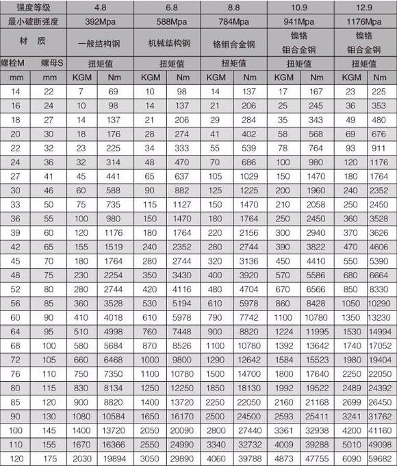 相信許多用戶在選購液壓扭矩扳手之前都看過液壓扳手扭矩對照表,液壓扳手扭矩對照表其實就是螺栓扭矩值推薦表,它主要被用來查詢螺栓螺母的強度等級、材質(zhì)和螺栓大小扭矩值的一張表格,能夠更好的幫助用戶選擇合適的扳手型號,下圖就是液壓扳手扭矩對照表。