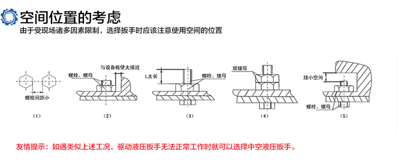 大家都知道液壓扳手有許多不同的型號,幾型液壓扳手就是不同型號的液壓扳手,大家在進行液壓扳手選購的時候,也要弄清楚,到底什么型號的液壓扳手適合使用,想要選擇合適的液壓扳手,大家需知道:螺栓大小、螺栓等級強度、螺栓工況以及扭矩要求,有了這些數(shù)據(jù)之后才能更好地幫助你進行選購。下面是空間位置選型: