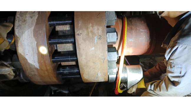其實大型水輪機的很多位置也都是使用使用高強螺栓連接,像基礎(chǔ)環(huán)、座環(huán)、蝸売、尾水管排水盤形閥及其附件、蝸殼排水盤形閥及其附件機坑里襯底環(huán)、頂蓋、轉(zhuǎn)輪導(dǎo)葉及操作機構(gòu)、接力器、主軸及密封、輪機導(dǎo)軸承大軸自然補氣裝置等。這些螺栓的安裝預(yù)緊之后需要經(jīng)受住惡劣的運行環(huán)境,因此預(yù)緊力要求也是比較高。水輪機安裝預(yù)緊或者檢修做采用的螺栓預(yù)緊工具一般是以液壓螺栓拉伸器為主。液壓螺栓拉伸器軸向拉伸,螺栓上所加載的預(yù)緊力損耗較少,有效加載更多。但在一些特殊的位置,螺栓周圍空間特別小,只能使用薄型的中空液壓扳手來進行預(yù)緊拆卸。因此,水輪機的安裝檢維修既需要螺栓拉伸器也需要液壓扳手。