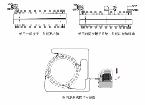 對于較大的扳手,建議用一臺泵控制兩同步系統(tǒng),或二泵二扳手同時對邊鎖緊的雙系統(tǒng)。