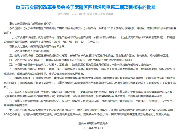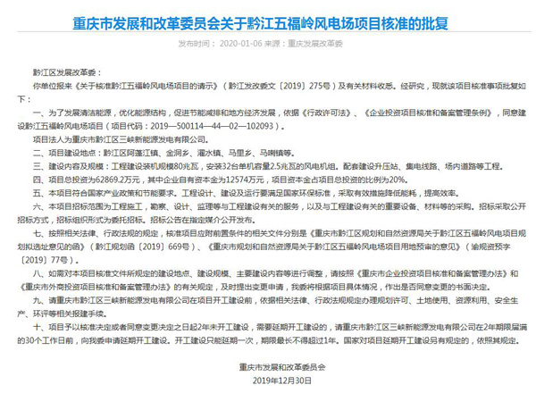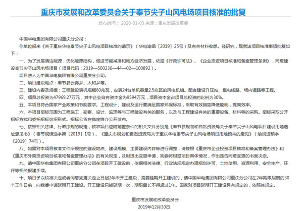 2019年12月30日,重慶市新核準(zhǔn)三個(gè)風(fēng)電項(xiàng)目,分別是奉節(jié)尖子山風(fēng)電場(chǎng)項(xiàng)目、武隆區(qū)四眼坪風(fēng)電場(chǎng)二期項(xiàng)目、黔江五福嶺風(fēng)電場(chǎng)項(xiàng)目。三個(gè)項(xiàng)目總?cè)萘拷咏?00MW。