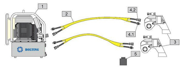 液壓扳手是由本體、電動(dòng)液壓泵、雙聯(lián)高壓油管、高強(qiáng)度套筒組成。液壓泵啟動(dòng)后通過馬達(dá)產(chǎn)生壓力,將內(nèi)部的液壓油通過油管介質(zhì)傳送到液壓扳手,然后推動(dòng)液壓扳手的活塞桿,由活塞桿帶動(dòng)扳手前部的棘輪使棘輪能帶動(dòng)驅(qū)動(dòng)軸來完成螺栓的預(yù)緊拆松工作。
